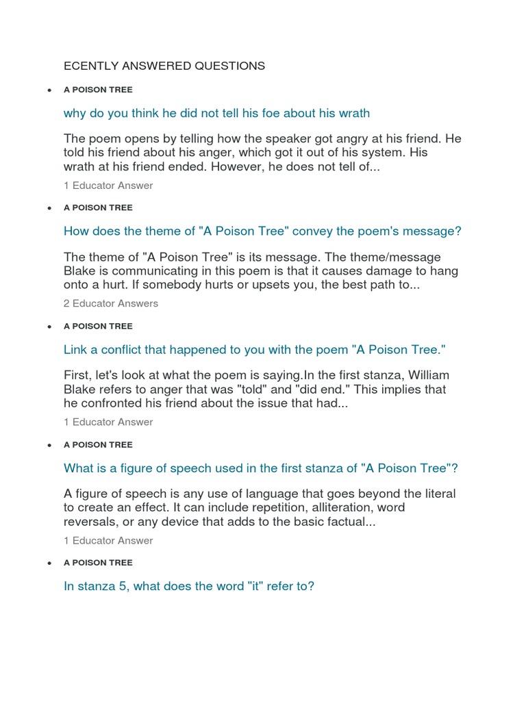 Tree is a poem that ends with a foe underneath a poisoned tree The poems title is a reference to the poem The Poisoned Tree by. The poem reflects on the bitter effects of the suppressed feeling of enmity. I told my wrath my wrath did end.